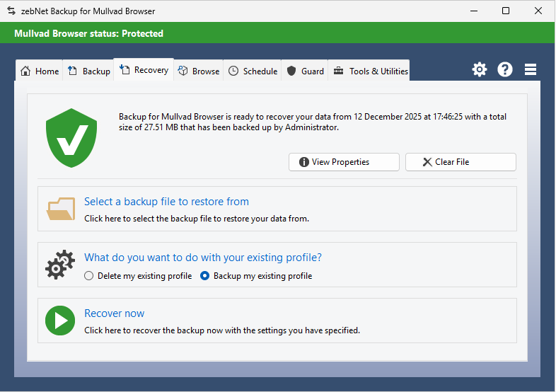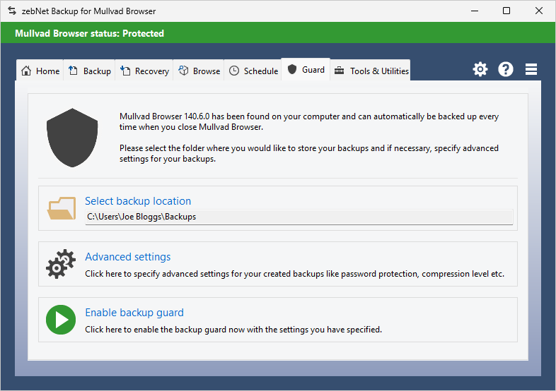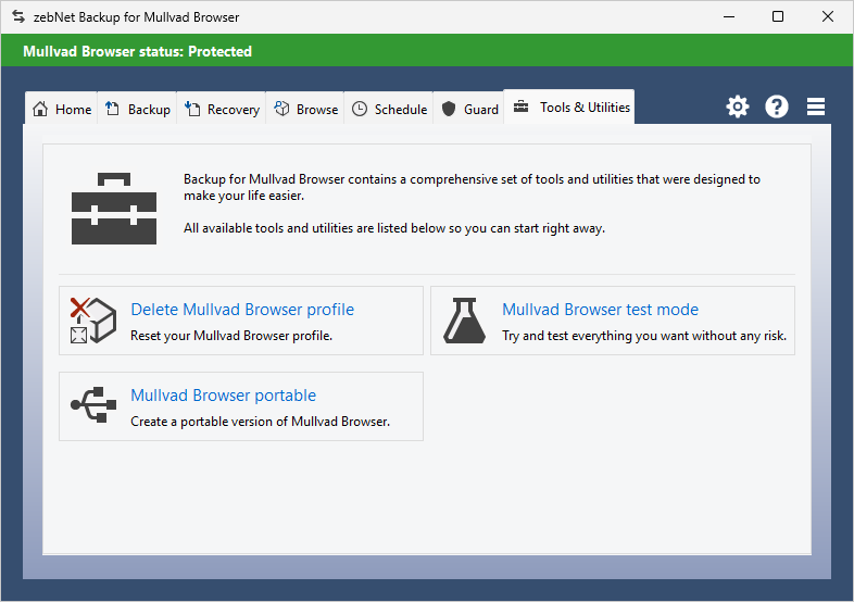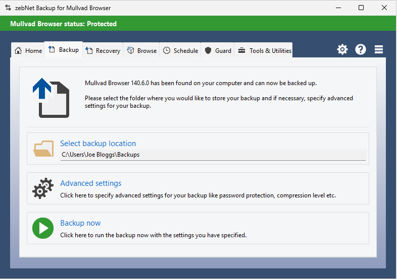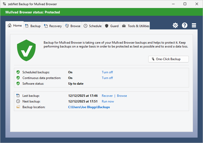 Have a look at the screenshots to get a first impression of what working with zebNet Backup for Mullvad Browser looks like. Each image is only a thumbnail and you can click on an image to enlarge it.