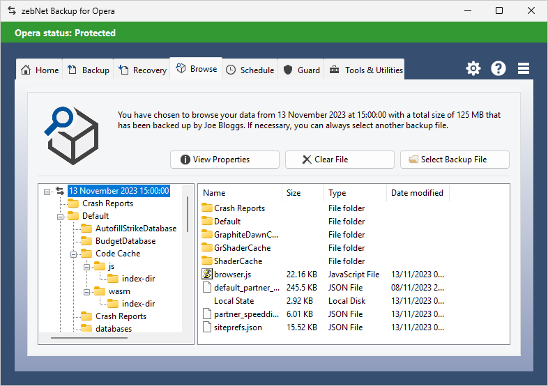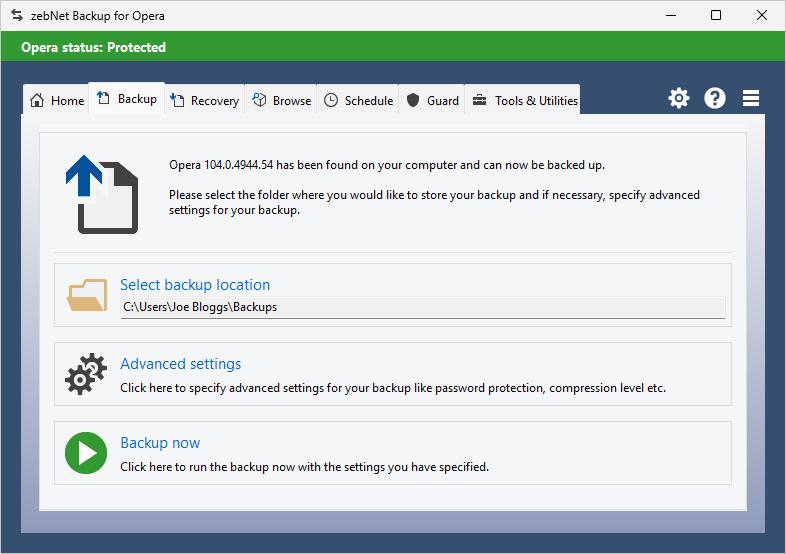 Have a look at the screenshots to get a first impression of what working with zebNet Backup for Opera Browser looks like. Each image is only a thumbnail and you can click on an image to enlarge it.