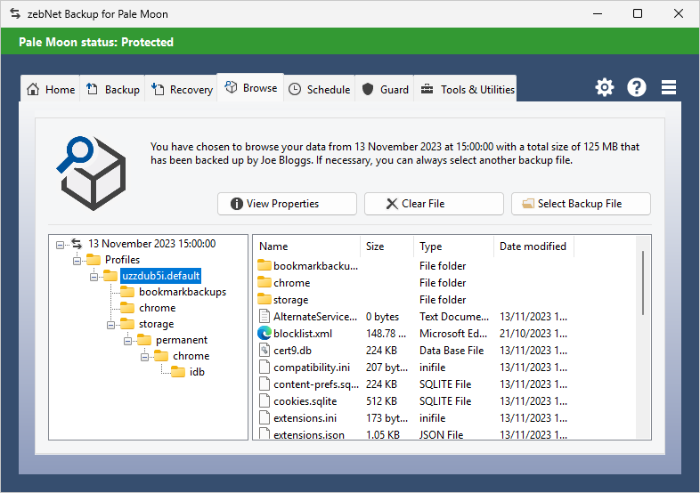 Have a look at the screenshots to get a first impression of what working with zebNet Backup for Pale Moon looks like. Each image is only a thumbnail and you can click on an image to enlarge it.
