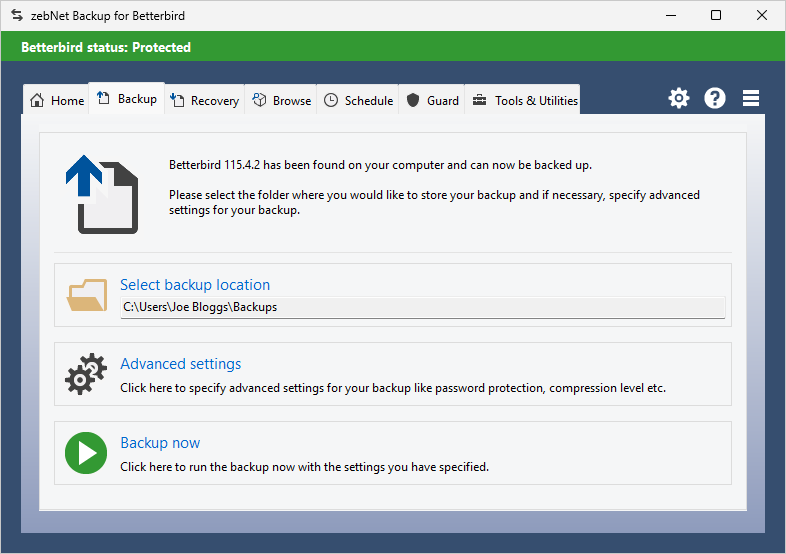 Have a look at the screenshots to get a first impression of what working with zebNet Backup for Mailbird looks like. Each image is only a thumbnail and you can click on an image to enlarge it.