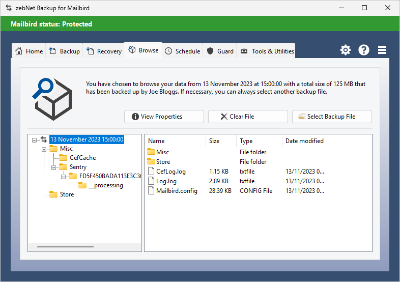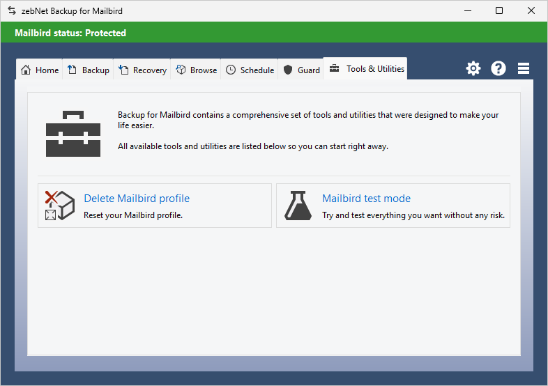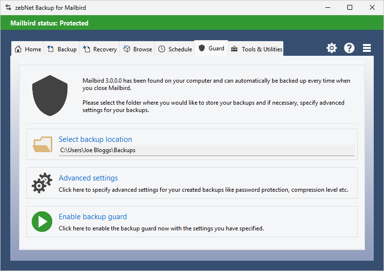 Have a look at the screenshots to get a first impression of what working with zebNet Backup for Mailbird looks like. Each image is only a thumbnail and you can click on an image to enlarge it.