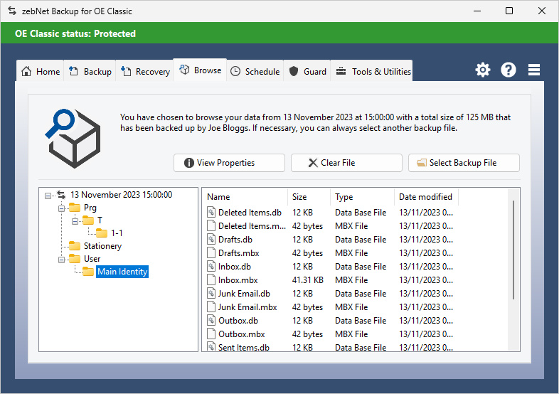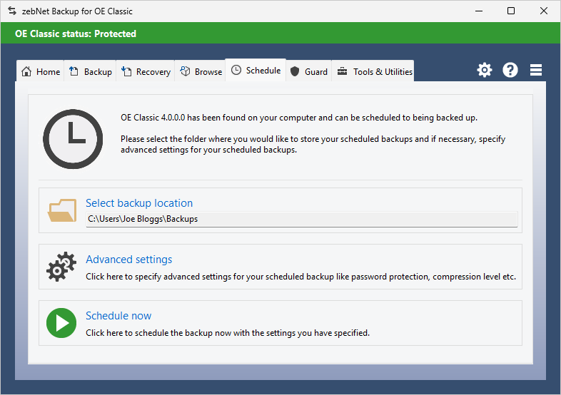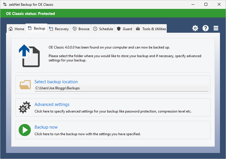 Have a look at the screenshots to get a first impression of what working with zebNet Backup for OE Classic looks like. Each image is only a thumbnail and you can click on an image to enlarge it.