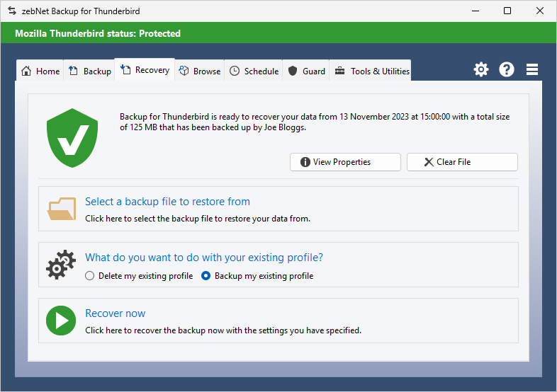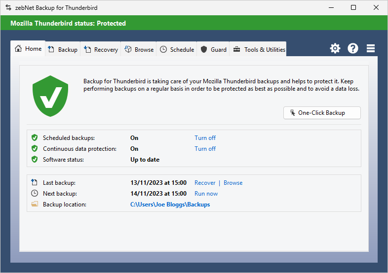 Have a look at the screenshots to get a first impression of what working with zebNet Backup for Thunderbird looks like. Each image is only a thumbnail and you can click on an image to enlarge it.